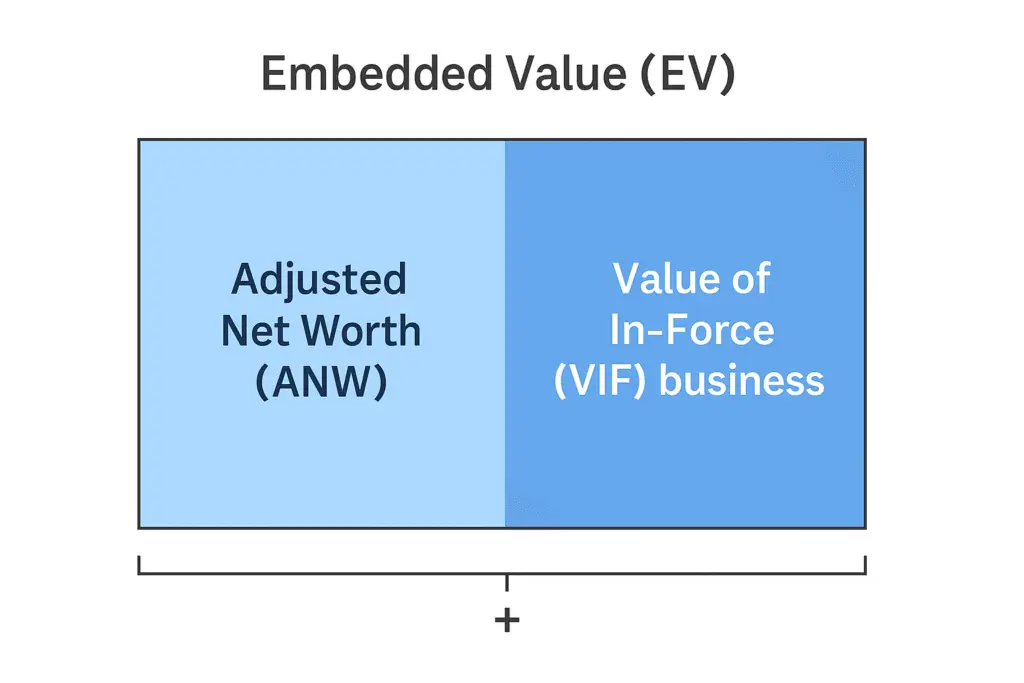 Embedded Value (EV) is an actuarial valuation metric used primarily in life insurance to quantify the value of the business today, beyond what standard financial statements show. In simple terms, EV represents the consolidated value of the shareholders’ interests in the company. Equivalently, it can be viewed as the net asset value (capital and surplus) plus the present value of future profits from existing (in-force) policies, under best-estimate assumptions. Notably, EV excludes any value from future sales or new business.